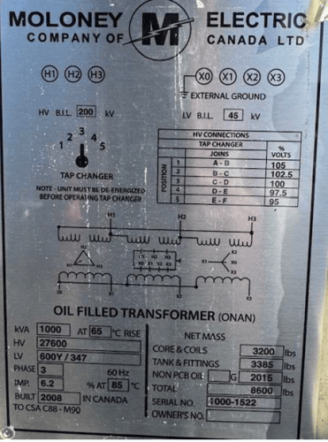 1000 KVA 27600 Primary, 600Y/347 Secondary, Moloney, oil filled transformer